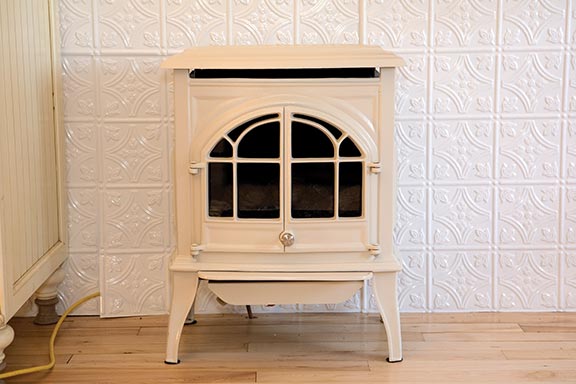 I picked out an Enviro Ascot freestanding propane cast-iron fireplace (www.enviro.com, $1243) at my local building supply store, but had them order a can of high heat off-white paint so I could change its color. Remember to bolt your fireplace securely to the wall and/or floor, and be sure that the venting and gas plumbing is done to meet all installation standards.