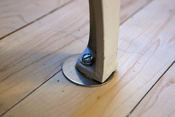 Ta-da! The stove was bolted to the floor with a washer in between. When my trailer is in motion on the road, the fake ceramic logs and the cast-iron top need to be removed and stowed.