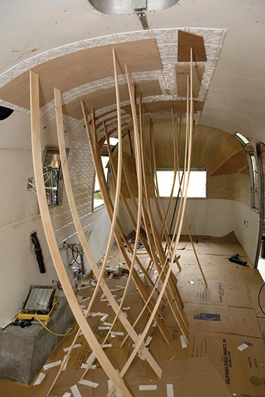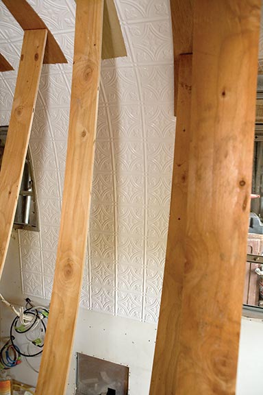 I added pizzazz to the walls and ceiling with Decorative Thermoplastic Backsplash Panels from ACPIdeas.com (about $800). To hold them in place while the glue dried and to apply pressure to the glue tape that adheres the panels, a bit of bracing was in order. We used strips of scrap plywood cut slightly longer than the height of the ceiling, then “sprung” it into place using the stiffness and flexibility of the wood to make a firm brace.