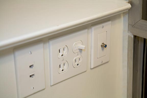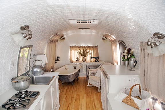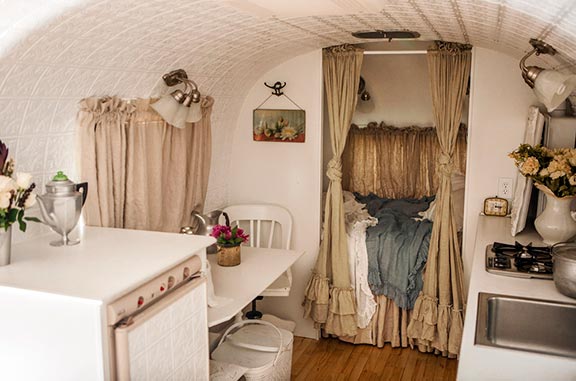 On the window above the sink, there wasn’t room for a curtain between the curved wall and the faucet. A piece of the ⅛ inch flexible door “skins” that were used on the curved ceilings, held in place by window swivel clips, worked like a charm—it pops out when I want to uncover the window.
