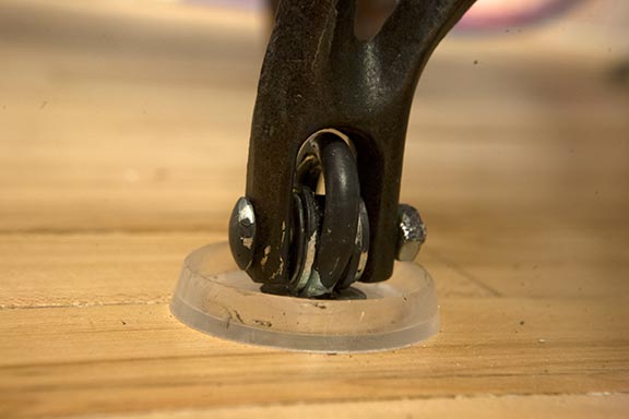 My sewing machine was put on four plastic coasters, and then an eye bolt secured it permanently to the floor.